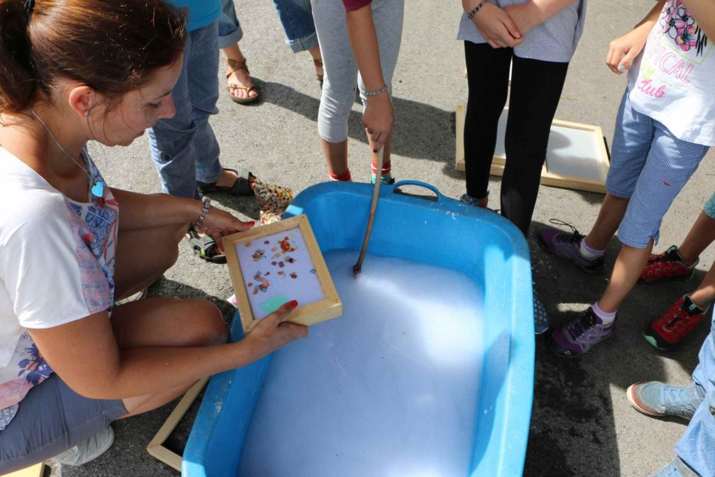 Höhepunkt wird das gemeinsame Herstellen von „neuem“ Papier aus Altpapier sein. Beim Papierschöpfen wird man selbst zum Papiermacher. Das geschöpfte Papier kann dann in ein Kunstwerk verwandelt werden.